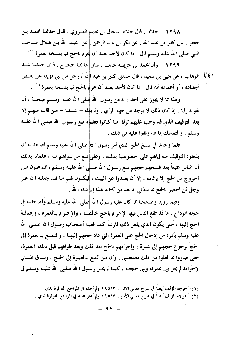 1299 - وَأَنَّ مُحَمَّدَ بْنَ خُزَيْمَةَ، حَدَّثَنَا، قَالَ: حَدَّثَنَا حَجَّاجٌ، قَالَ: حَدَّثَنَا عَبْدُ الْوَهَّابِ، عَنْ يَحْيَى بْنِ سَعِيدٍ، قَالَ: حَدَّثَنِي كَثِيرُ بْنُ عَبْدِ اللهِ رَجُلٌ مِنْ بَنِي مُزَيْنَةَ، عَنْ بَعْضِ أَجْدَادِهِ أَوْ أَعْمَامِهِ، أَنَّهُ قَالَ: " مَا كَانَ لِأَحَدٍ بَعْدَنَا أَنْ يُحْرِمَ بِالْحَجِّ ثُمَّ يَفْسَخَهُ بِعُمْرَةٍ " وَهَذَا مِمَّا لَا يَجُوزُ عَلَى أَحَدٍ، لَهُ مِنْ رَسُولِ اللهِ صَلَّى اللَّهُ عَلَيْهِ وَسَلَّمَ صُحْبَةٌ، أَنْ يَقُولَهُ رَأْيًا، إِذْ كَانَ ذَلِكَ لَا يُوجَدُ مِنْ جِهَةِ الرَّأْيِ، وَلَمْ يَقُلْهُ، عِنْدَنَا، مَنْ قَالَهُ مِنْهُمْ إِلَّا بَعْدَ التَّوْقِيفِ الَّذِي قَدْ وَجَّبَ عَلَيْهِمْ تَرْكَ مَا كَانُوا فَعَلُوهُ مَعَ رَسُولِ اللهِ صَلَّى اللَّهُ عَلَيْهِ وَسَلَّمَ، وَالتَّمَسُّكَ بِمَا قَدْ وَقَفُوا عَلَيْهِ مِنْ ذَلِكَ فَلَمَّا وَجَدْنَا فِي فَسْخِ الْحَجِّ الَّذِي أَمَرَ رَسُولُ اللهِ صَلَّى اللَّهُ عَلَيْهِ وَسَلَّمَ أَصْحَابَهُ أَنْ يَفْعَلُوهُ التَّوْقِيفَ مِنْهُ إِيَّاهُمْ عَلَى الْخُصُوصِيَّةِ بِذَلِكَ، وَعَلى مَنْ سِوَاهُمْ مِنْهُ، عَلِمْنَا بِذَلِكَ أَنَّ النَّاسَ جَمِيعًا بَعْدَ فَسْخِهِمْ حَجِّهِمْ مَعَ رَسُولِ اللهِ صَلَّى اللَّهُ عَلَيْهِ وَسَلَّمَ مَمْنُوعُونَ مِنَ الْخُرُوجِ مِنَ الْحَجِّ إِلَّا بِإِتْمَامِهِ، إِلَّا أَنْ يُصَدُّوا عَنِ الْبَيْتِ، فَيَكُونُ لَهُمْ مَا قَدْ جَعَلَهُ اللهُ عَزَّ وَجَلَّ لِمَنْ أُحْصِرَ بِالْحَجِّ مِمَّا