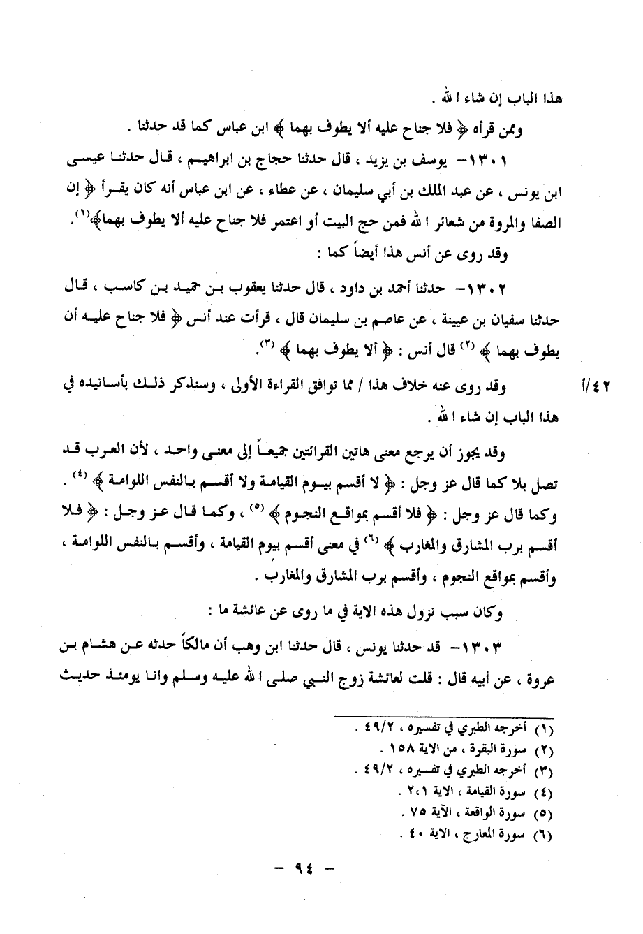 1302 - حَدَّثَنَا أَحْمَدُ بْنُ دَاوُدَ، قَالَ: حَدَّثَنَا يَعْقُوبُ بْنُ حُمَيْدِ بْنِ كَاسِبٍ، قَالَ: حَدَّثَنَا سُفْيَانُ بْنُ عُيَيْنَةَ، عَنْ عَاصِمِ بْنِ سُلَيْمَانَ، قَالَ: قَرَأْتُ عِنْدَ أَنَسٍ: {فَلا جُنَاحَ عَلَيْهِ أَنْ يَطَّوَّفَ بِهِمَا} ، قَالَ أَنَسٌ: " أَلَّا يَطَّوَّفَ بِهِمَا " وَقَدْ رُوِيَ عَنْهُ خِلَافُ هَذَا مِمَّا تُوَافِقُ الْقِرَاءَةَ الْأُولَى، وَسَنَذْكُرُ ذَلِكَ بِأَسَانِيدِهِ فِي هَذَا الْبَابِ إِنْ شَاءَ اللهُ وَقَدْ يَجُوزُ أَنْ يَرْجِعَ مَعْنَى هَاتَيْنِ الْقِرَاءَتَيْنِ جَمِيعًا إِلَى مَعْنًى وَاحِدٍ