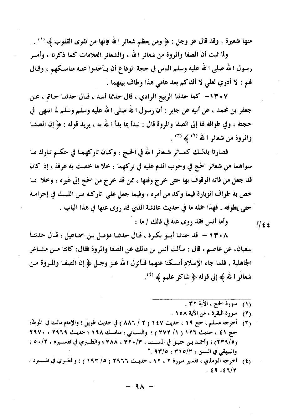 1308 - قَدْ حَدَّثَنَا أَبُو بَكْرَةَ، قَالَ: حَدَّثَنَا مُؤَمَّلُ بْنُ إِسْمَاعِيلَ، قَالَ: حَدَّثَنَا سُفْيَانُ، عَنْ عَاصِمٍ، قَالَ: سَأَلْتُ أَنَسَ بْنَ مَالِكٍ عَنِ الصَّفَا وَالْمَرْوَةِ، فَقَالَ: " كَانَتَا مِنْ مَشَاعِرِ الْجَاهِلِيَّةِ، فَلَمَّا جَاءَ الْإِسْلَامُ أَمْسَكْنَا عَنْهُمَا، فَأَنْزَلَ اللهُ عَزَّ وَجَلَّ: {إِنَّ الصَّفَا وَالْمَرْوَةَ مِنْ شَعَائِرِ اللهِ} ، إِلَى قَوْلِهِ: {شَاكِرٌ عَلِيمٌ} "،