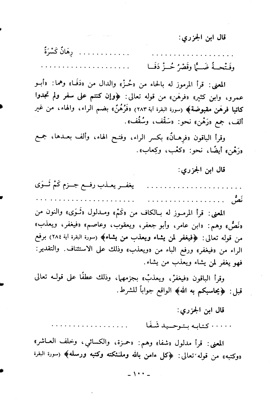 المعنى: قرأ المرموز له بالحاء من «حز» والدال من «دفا» وهما: «أبو عمرو، وابن كثير» «فرهن» من قوله تعالى: وَإِنْ كُنْتُمْ عَلى سَفَرٍ وَلَمْ تَجِدُوا كاتِباً فَرِهانٌ مَقْبُوضَةٌ (سورة البقرة آية 283) «فرهن» بضم الراء، والهاء، من غير ألف، جمع «رهن» نحو: «سقف، وسقف».