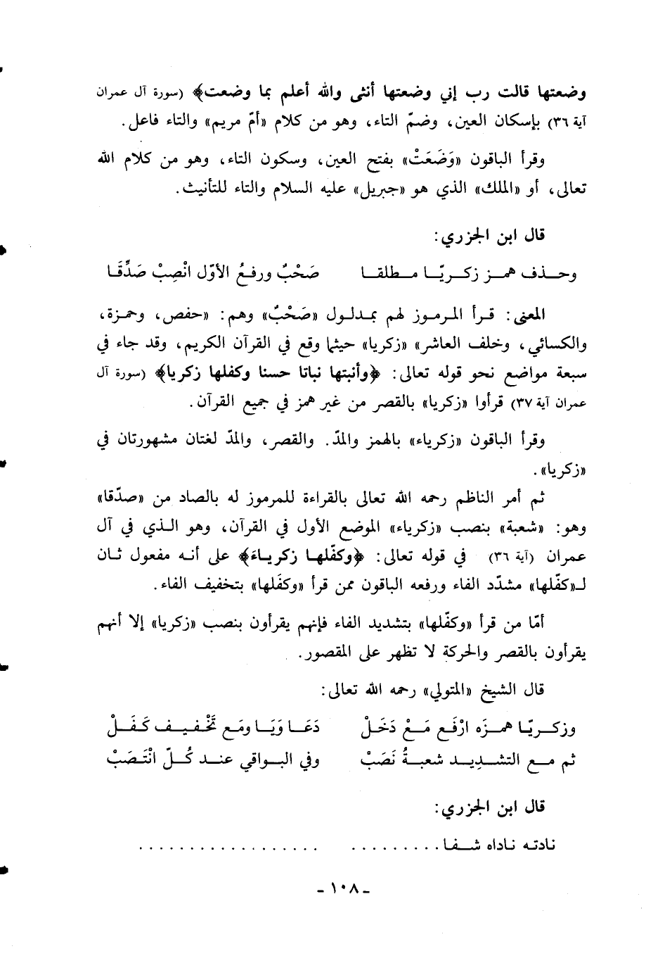 المعنى: قرأ المرموز لهم بمدلول «صحب» وهم: «حفص، وحمزة، والكسائي، وخلف العاشر» «زكريا» حيثما وقع في القرآن الكريم، وقد جاء في سبعة مواضع نحو قوله تعالى: وَأَنْبَتَها نَباتاً حَسَناً وَكَفَّلَها زَكَرِيَّا (سورة آل عمران آية 37) قرءوا «زكريا» بالقصر من غير همز في جميع القرآن.