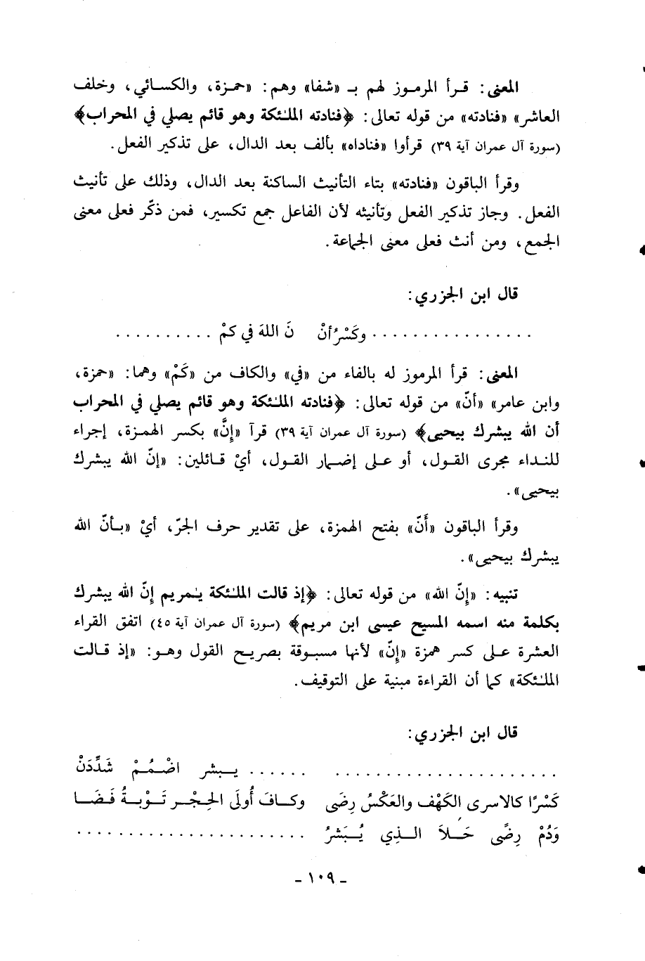 (سورة آل عمران آية 39) قر «إنّ» بكسر الهمزة، إجراء للنداء مجرى القول، أو على إضمار القول، أي قائلين: «إنّ الله يبشرك بيحيى».