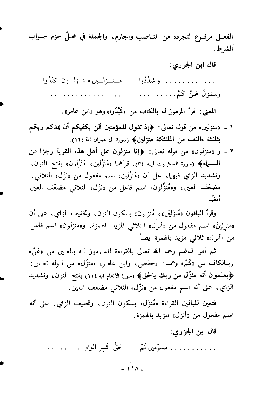 يَعْلَمُونَ أَنَّهُ مُنَزَّلٌ مِنْ رَبِّكَ بِالْحَقِّ (سورة الأنعام آية 114) بفتح النون، وتشديد الزاي، على أنه اسم مفعول من «نزّل» الثلاثي مضعف العين.