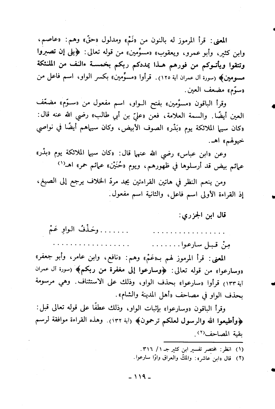 المعنى: قرأ المرموز لهم ب «عم» وهم: «نافع، وابن عامر، وأبو جعفر» «وسارعوا» من قوله تعالى: وَسارِعُوا إِلى مَغْفِرَةٍ مِنْ رَبِّكُمْ (سورة آل عمران آية 133) قرءوا «سارعوا» بحذف الواو، وذلك على الاستئناف. وهي مرسومة بحذف الواو في مصاحف «أهل المدينة والشام».