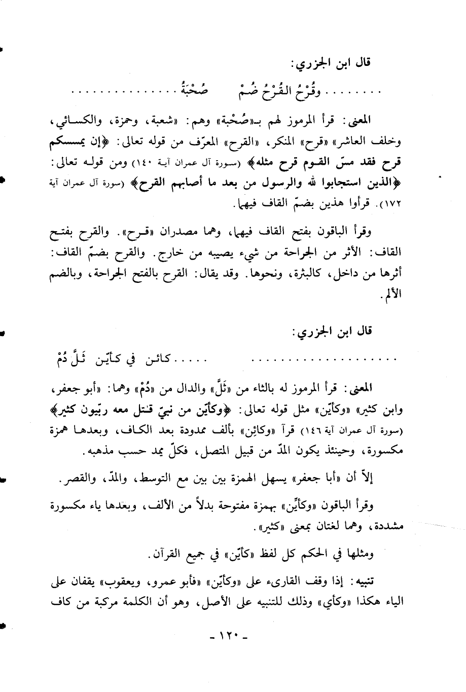 المعنى: قرأ المرموز لهم ب «صحبة» وهم: «شعبة، وحمزة، والكسائي، وخلف العاشر» «قرح» المنكر، «القرح» المعرّف من قوله تعالى: إِنْ يَمْسَسْكُمْ قَرْحٌ فَقَدْ مَسَّ الْقَوْمَ قَرْحٌ مِثْلُهُ (سورة آل عمران آية 140) ومن قوله تعالى: