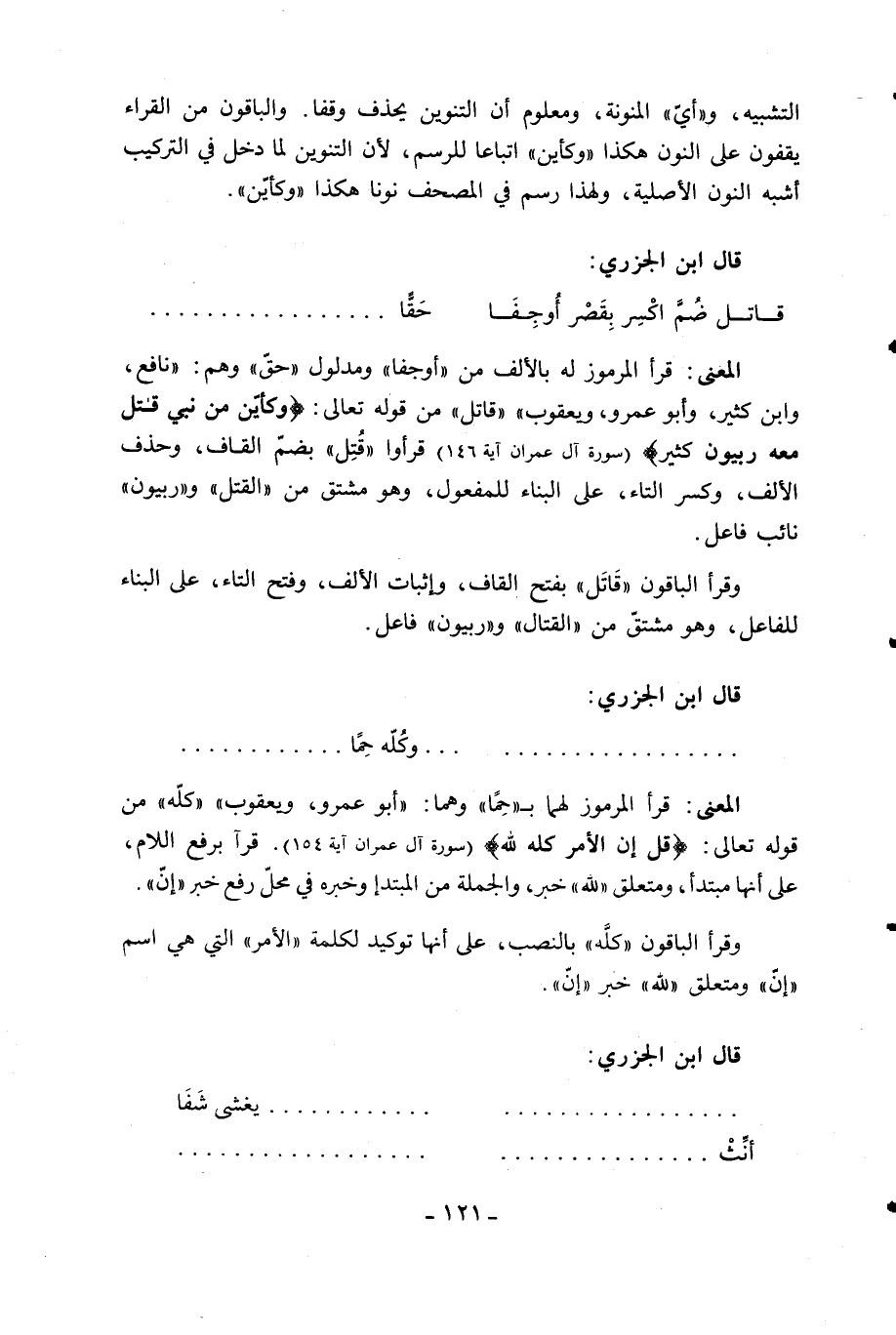 المعنى: قرأ المرموز له بالألف من «أوجفا» ومدلول «حقّ» وهم: «نافع، وابن كثير، وأبو عمرو، ويعقوب» «قاتل» من قوله تعالى: وَكَأَيِّنْ مِنْ نَبِيٍّ قاتَلَ مَعَهُ رِبِّيُّونَ كَثِيرٌ (سورة آل عمران آية 146) قرءوا «قتل» بضمّ القاف، وحذف الألف، وكسر التاء، على البناء للمفعول، وهو مشتق من «القتل» و «ربيون» نائب فاعل.