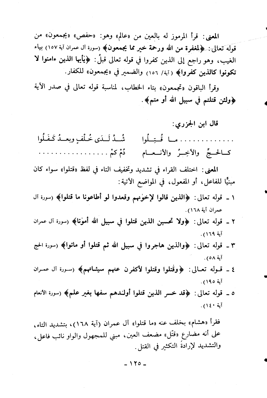 المعنى: اختلف القراء في تشديد وتخفيف التاء في لفظ «قتلوا» سواء كان مبنيّا للفاعل، أو المفعول، في المواضع الآتية: