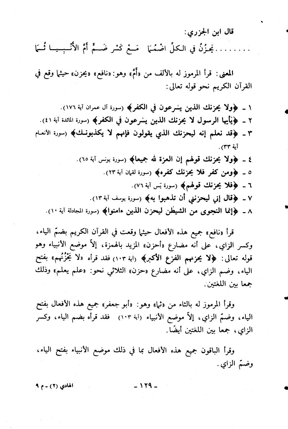 المعنى: قرأ المرموز له بالألف من «أمّ» وهو: «نافع» «يحزن» حيثما وقع في القرآن الكريم نحو قوله تعالى: