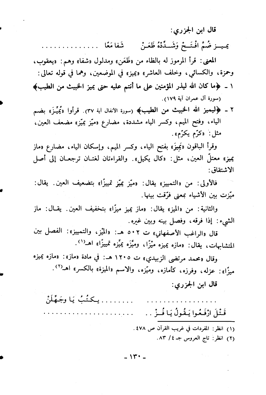 المعنى: قرأ المرموز له بالظاء من «ظعن» ومدلول «شفا» وهم: «يعقوب، وحمزة، والكسائي، وخلف العاشر» «يميز» في الموضعين، وهما في قوله تعالى: