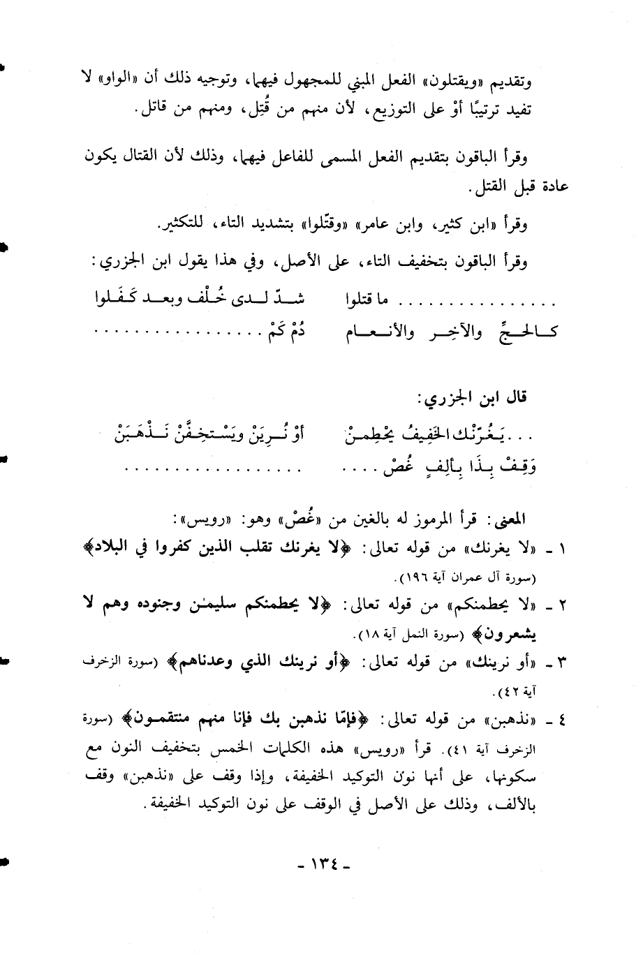 وتقديم «ويقتلون» الفعل المبني للمجهول فيهما، وتوجيه ذلك أن «الواو» لا تفيد ترتيبا أو على التوزيع، لأن منهم من قتل، ومنهم من قاتل.