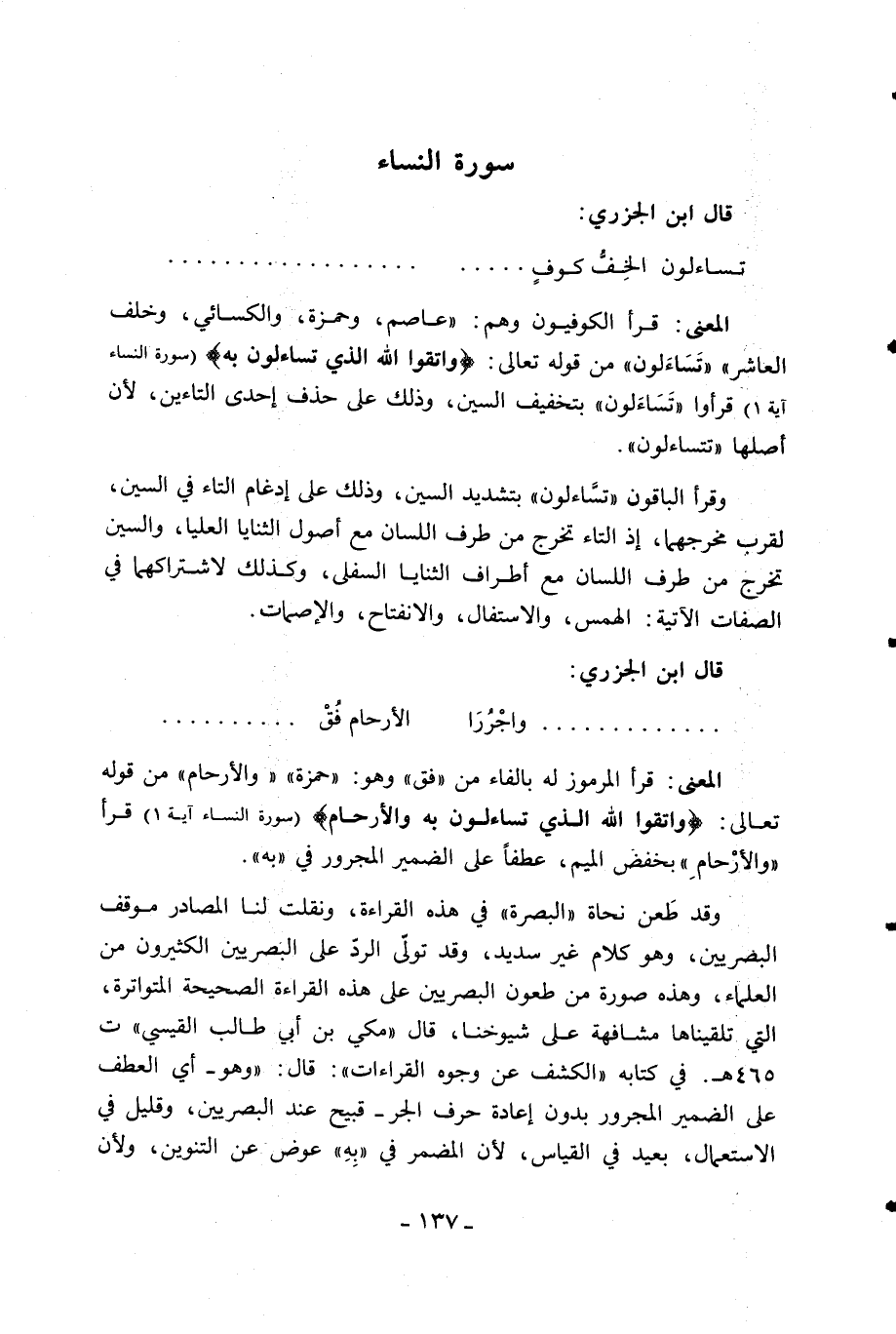 المعنى: قرأ الكوفيون وهم: «عاصم، وحمزة، والكسائي، وخلف العاشر» «تساءلون» من قوله تعالى: وَاتَّقُوا اللَّهَ الَّذِي تَسائَلُونَ بِهِ (سورة النساء آية 1) قرءوا «تساءلون» بتخفيف السين، وذلك على حذف إحدى التاءين، لأن أصلها «تتساءلون».