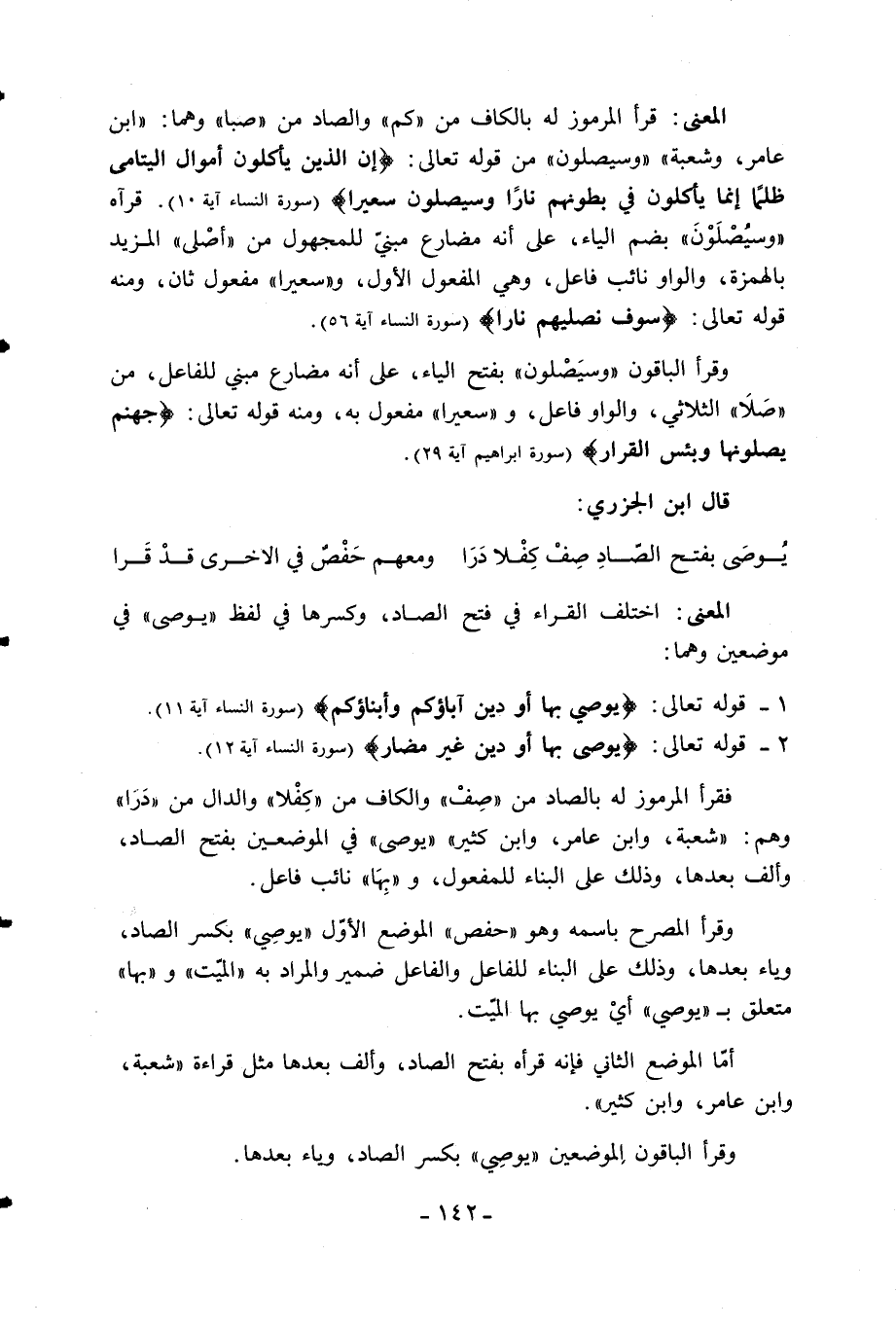 المعنى: قرأ المرموز له بالكاف من «كم» والصاد من «صبا» وهما: «ابن عامر، وشعبة» «وسيصلون» من قوله تعالى: إِنَّ الَّذِينَ يَأْكُلُونَ أَمْوالَ الْيَتامى ظُلْماً إِنَّما يَأْكُلُونَ فِي بُطُونِهِمْ ناراً وَسَيَصْلَوْنَ سَعِيراً (سورة النساء آية 10). قرءاه «وسيصلون» بضم الياء، على أنه مضارع مبنيّ للمجهول من «أصلى» المزيد بالهمزة، والواو نائب فاعل، وهي المفعول الأول، و «سعيرا» مفعول ثان، ومنه قوله تعالى: سَوْفَ نُصْلِيهِمْ ناراً (سورة النساء آية 56).