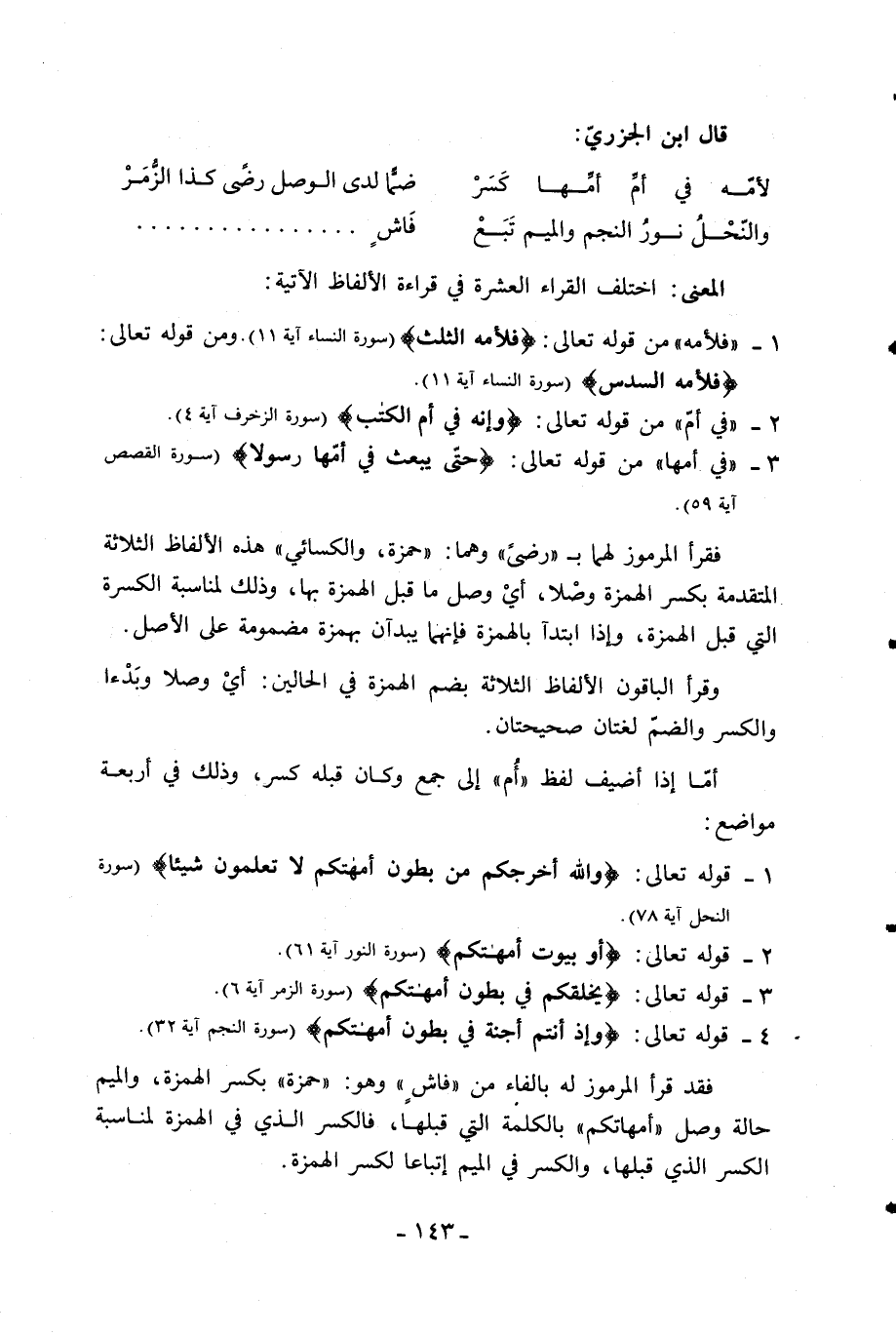 فقد قرأ المرموز له بالفاء من «فاش» وهو: «حمزة» بكسر الهمزة، والميم حالة وصل «أمهاتكم» بالكلمة التي قبلها، فالكسر الذي في الهمزة لمناسبة الكسر الذي قبلها، والكسر في الميم اتباعا لكسر الهمزة.