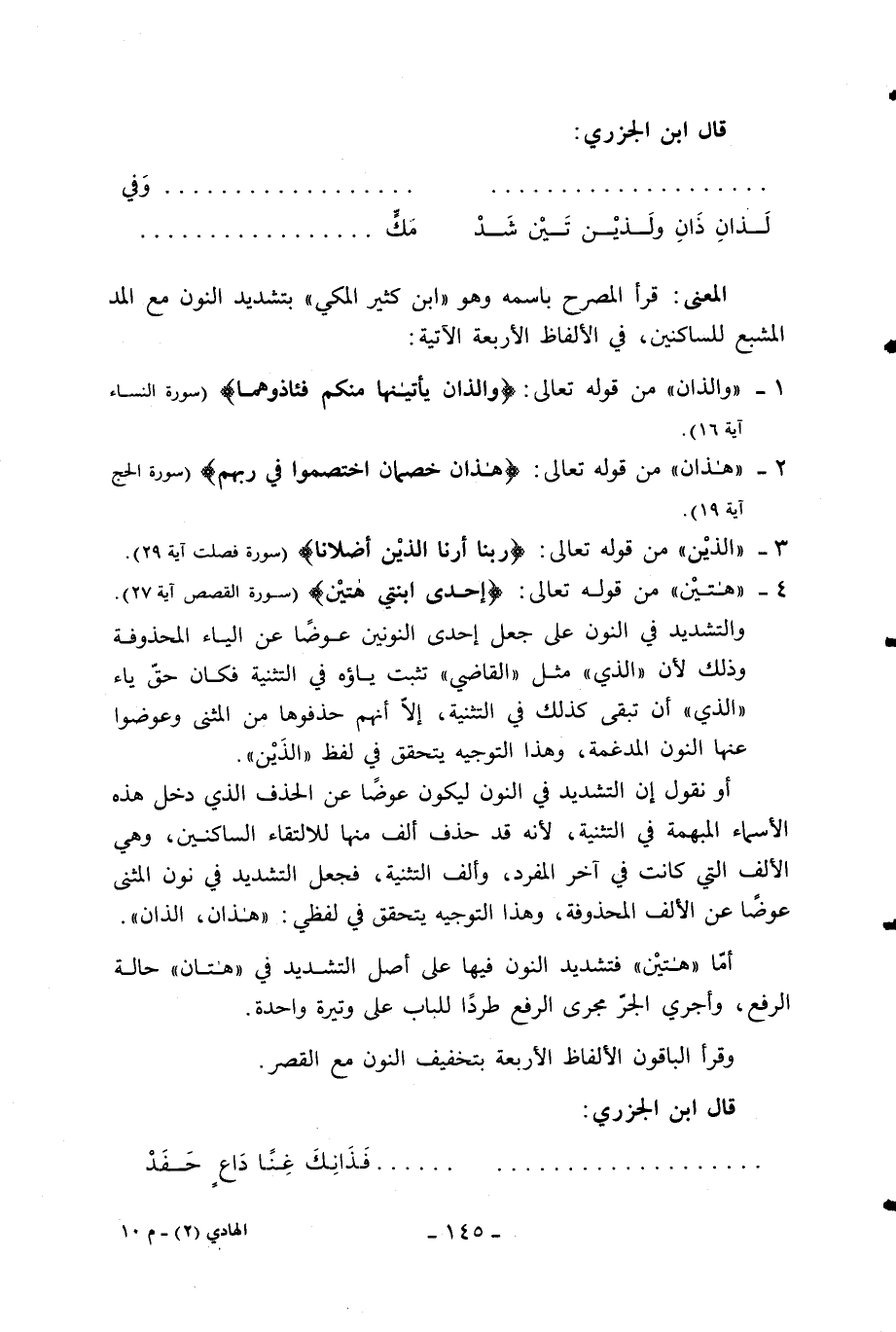 المعنى: قرأ المصرح باسمه وهو «ابن كثير المكي» بتشديد النون مع المد المشبع للساكنين، في الألفاظ الأربعة الآتية: