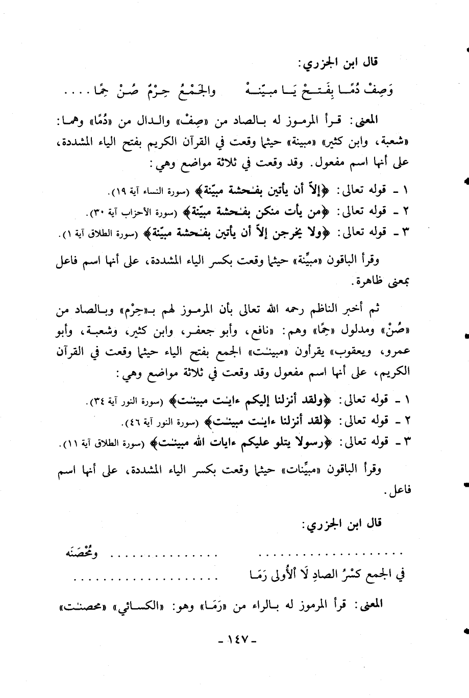 ثم أخبر الناظم رحمه الله تعالى بأن المرموز لهم ب «حرم» وبالصاد من «صن» ومدلول «حما» وهم: «نافع، وأبو جعفر، وابن كثير، وشعبة، وأبو عمرو، ويعقوب» يقرءون «مبينت» الجمع بفتح الياء حيثما وقعت في القرآن الكريم، على أنها اسم مفعول وقد وقعت في ثلاثة مواضع وهي: