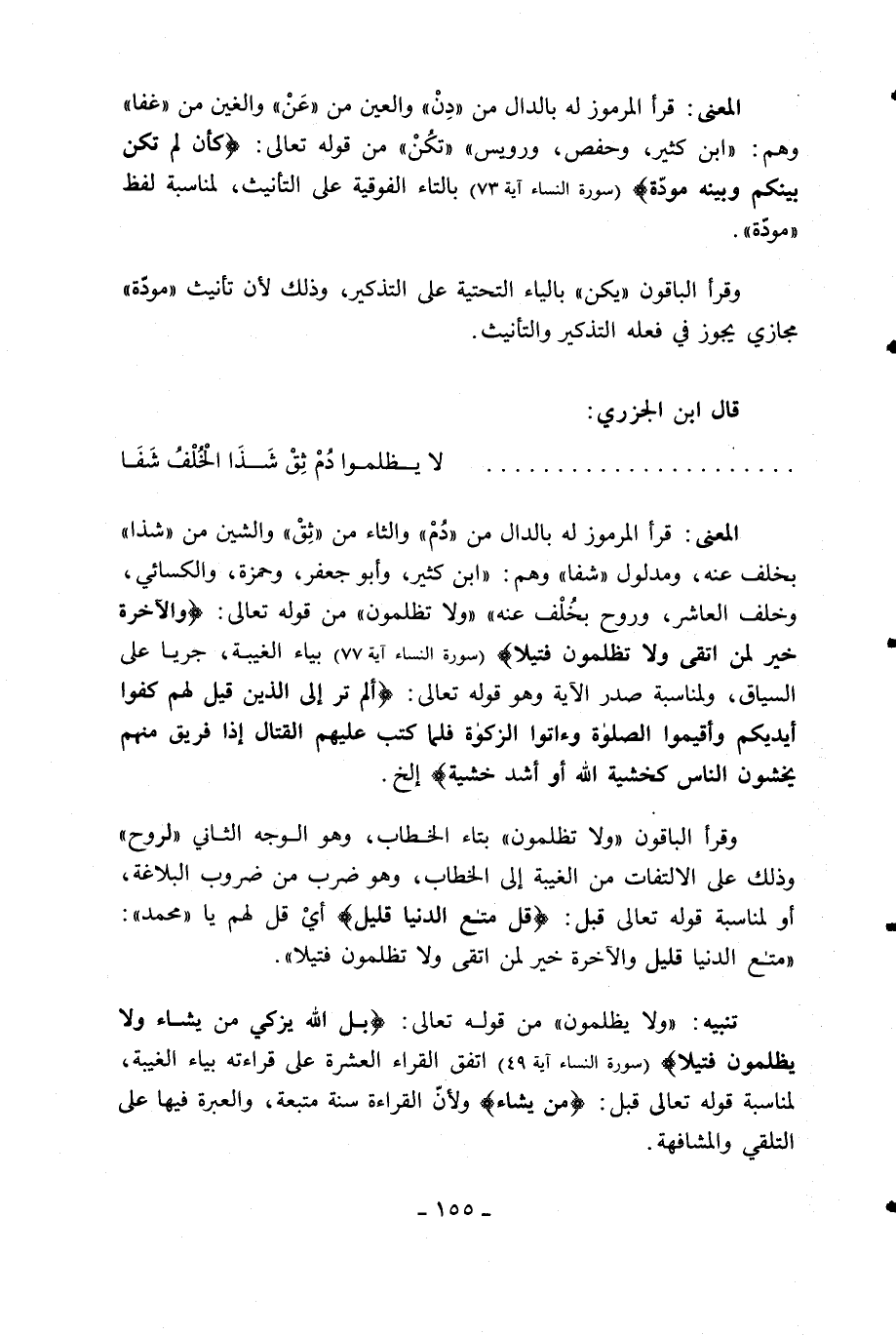 المعنى: قرأ المرموز له بالدال من «دم» والثاء من «ثق» والشين من «شذا» بخلف عنه، ومدلول «شفا» وهم: «ابن كثير، وأبو جعفر، وحمزة، والكسائي، وخلف العاشر، وروح بخلف عنه» «ولا تظلمون» من قوله تعالى: وَالْآخِرَةُ خَيْرٌ لِمَنِ اتَّقى وَلا تُظْلَمُونَ فَتِيلًا (سورة النساء آية 77) بياء الغيبة، جريا على السياق، ولمناسبة صدر الآية وهو قوله تعالى: أَلَمْ تَرَ إِلَى الَّذِينَ قِيلَ لَهُمْ كُفُّوا أَيْدِيَكُمْ وَأَقِيمُوا الصَّلاةَ وَآتُوا الزَّكاةَ فَلَمَّا كُتِبَ عَلَيْهِمُ الْقِتالُ إِذا فَرِيقٌ مِنْهُمْ يَخْشَوْنَ النَّاسَ كَخَشْيَةِ اللَّهِ أَوْ أَشَدَّ خَشْيَةً إلخ.