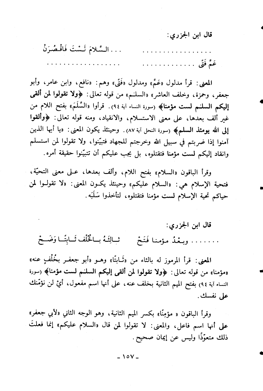 المعنى: قرأ مدلول «عمّ» ومدلول «فتى» وهم: «نافع، وابن عامر، وأبو جعفر، وحمزة، وخلف العاشر» «السلم» من قوله تعالى: وَلا تَقُولُوا لِمَنْ أَلْقى إِلَيْكُمُ السَّلامَ لَسْتَ مُؤْمِناً (سورة النساء آية 94). قرءوا «السّلم» بفتح اللام من غير ألف بعدها، على معنى الاستسلام، والانقياد، ومنه قوله تعالى: وَأَلْقَوْا إِلَى اللَّهِ يَوْمَئِذٍ السَّلَمَ (سورة النحل آية 87). وحينئذ يكون المعنى: «يا أيها الذين آمنوا إذا ضربتم في سبيل الله وخرجتم للجهاد فتبيّنوا، ولا تقولوا لمن استسلم وانقاد إليكم لست مؤمنا فتقتلوه، بل يجب عليكم أن تتبيّنوا حقيقة أمره.