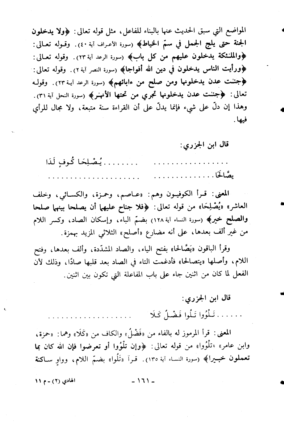 المعنى: قرأ الكوفيون وهم: «عاصم، وحمزة، والكسائي، وخلف العاشر» «يصلحا» من قوله تعالى: فَلا جُناحَ عَلَيْهِما أَنْ يُصْلِحا بَيْنَهُما صُلْحاً وَالصُّلْحُ خَيْرٌ (سورة النساء آية 128) بضمّ الباء، وإسكان الصاد، وكسر اللام من غير ألف بعدها، على أنه مضارع «أصلح» الثلاثي المزيد بهمزة.
