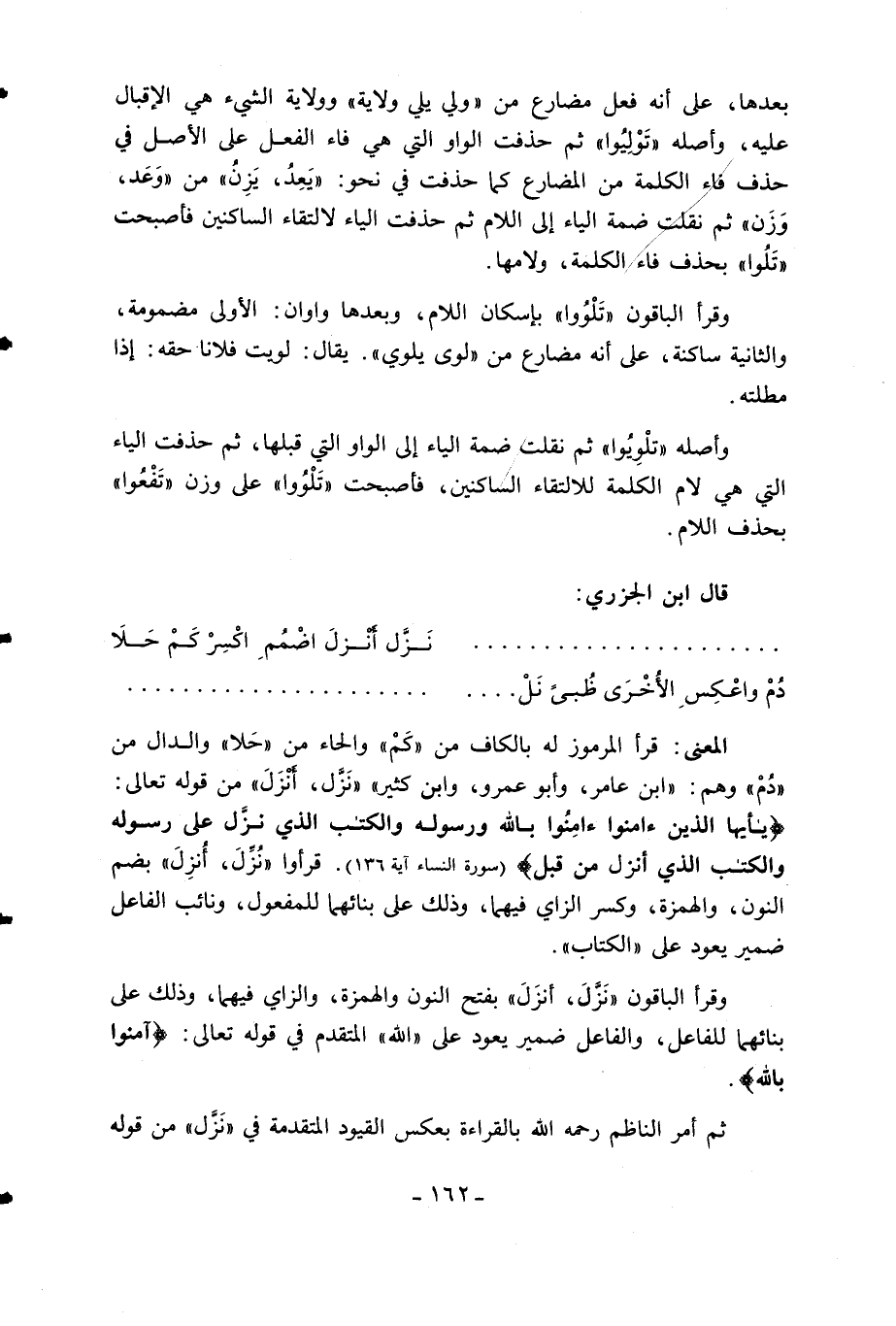 بعدها، على أنه فعل مضارع من «ولي يلي ولاية» وولاية الشيء هي الإقبال عليه، وأصله «توليوا» ثم حذفت الواو التي هي فاء الفعل على الأصل في حذف فاء الكلمة من المضارع كما حذفت في نحو: «يعد، يزن» من «وعد، وزن» ثم نقلت ضمة الياء إلى اللام ثم حذفت الياء لالتقاء الساكنين فأصبحت «تلوا» بحذف فاء الكلمة، ولامها.