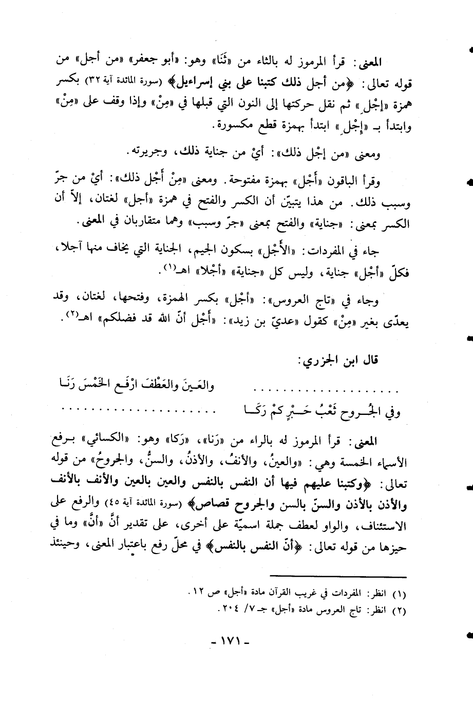 وقرأ الباقون «أجل» بهمزة مفتوحة. ومعنى «من أجل ذلك»: أي من جرّ وسبب ذلك. من هذا يتبيّن أن الكسر والفتح في همزة «أجل» لغتان، إلّا أن الكسر بمعنى: «جناية» والفتح بمعنى «جرّ وسبب» وهما متقاربان في المعنى.