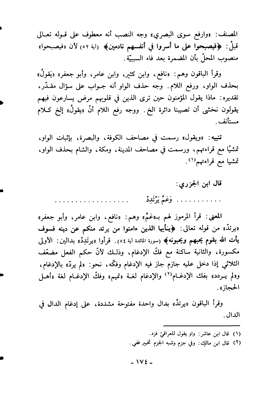 المعنى: قرأ المرموز لهم ب «عمّ» وهم: «نافع، وابن عامر، وأبو جعفر» «يرتدّ» من قوله تعالى: يا أَيُّهَا الَّذِينَ آمَنُوا مَنْ يَرْتَدَّ مِنْكُمْ عَنْ دِينِهِ فَسَوْفَ يَأْتِي اللَّهُ بِقَوْمٍ يُحِبُّهُمْ وَيُحِبُّونَهُ (سورة المائدة آية 54). قرءوا «يرتدد» بدالين: الأولى مكسورة، والثانية ساكنة مع فكّ الإدغام، وذلك لأنّ حكم الفعل مضعّف الثلاثي إذا دخل عليه جازم جاز فيه الإدغام وفكّه، نحو: «لم يردّ» بالإدغام، و «لم يردد» بفك الإدغام «2» والإدغام لغة «تميم» وفكّ الإدغام لغة «أهل الحجاز».