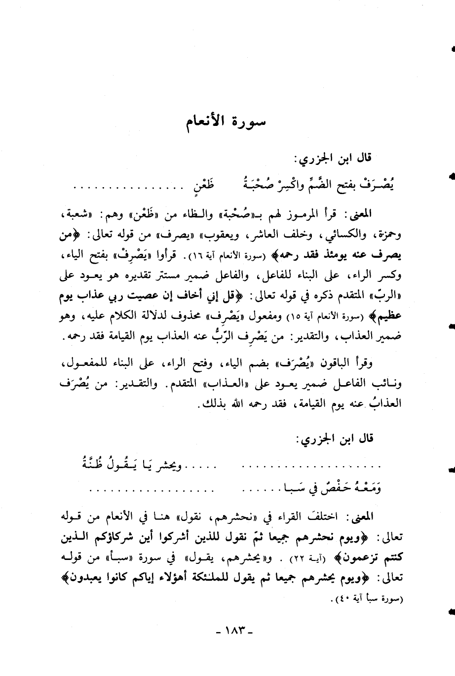 المعنى: اختلف القراء في «نحشرهم، نقول» هنا في الأنعام من قوله تعالى: وَيَوْمَ نَحْشُرُهُمْ جَمِيعاً ثُمَّ نَقُولُ لِلَّذِينَ أَشْرَكُوا أَيْنَ شُرَكاؤُكُمُ الَّذِينَ كُنْتُمْ تَزْعُمُونَ (آية 22). و «يحشرهم، يقول» في سورة «سبأ» من قوله تعالى: وَيَوْمَ يَحْشُرُهُمْ جَمِيعاً ثُمَّ يَقُولُ لِلْمَلائِكَةِ أَهؤُلاءِ إِيَّاكُمْ كانُوا يَعْبُدُونَ (سورة سبأ آية 40).