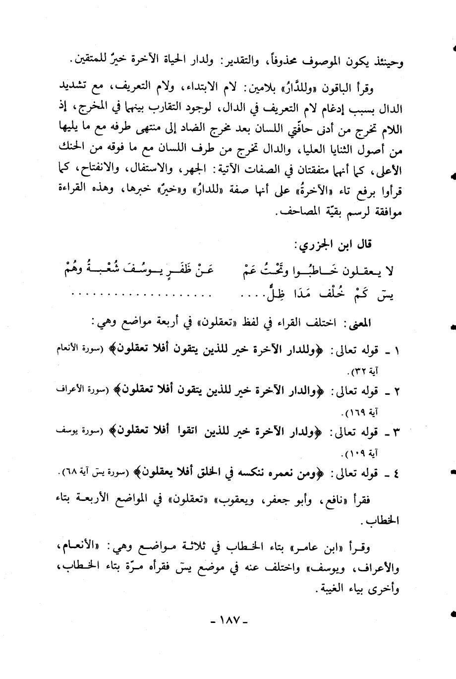 وقرأ الباقون «وللدّار» بلامين: لام الابتداء، ولام التعريف، مع تشديد الدال بسبب إدغام لام التعريف في الدال، لوجود التقارب بينهما في المخرج، إذ اللام تخرج من أدنى حافّتي اللسان بعد مخرج الضاد إلى منتهى طرفه مع ما يليها من أصول الثنايا العليا، والدال تخرج من طرف اللسان مع ما فوقه من الحنك الأعلى، كما أنهما متفقتان في الصفات الآتية: الجهر، والاستفال، والانفتاح، كما قرءوا برفع تاء «الآخرة» على أنها صفة «للدار» و «خير» خبرها، وهذه القراءة موافقة لرسم بقيّة المصاحف.