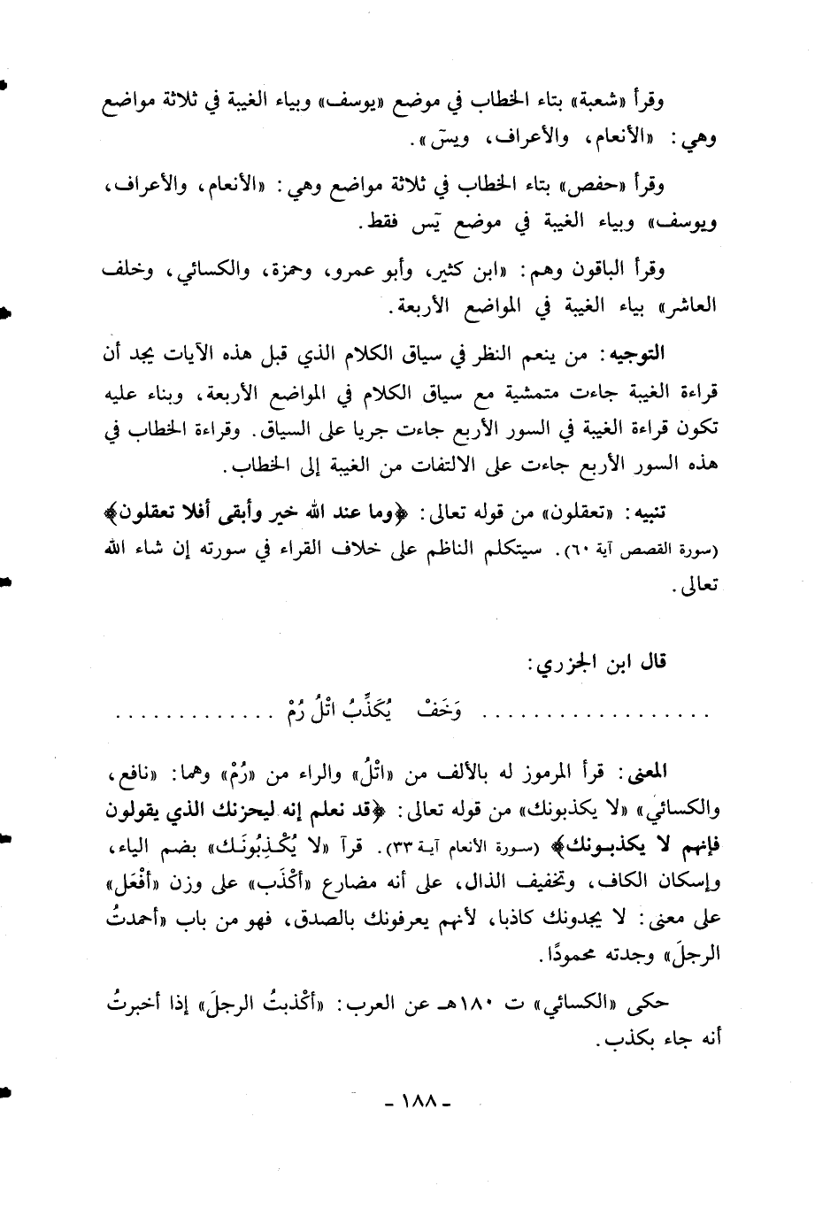 المعنى: قرأ المرموز له بالألف من «اتل» والراء من «رم» وهما: «نافع، والكسائي» «لا يكذبونك» من قوله تعالى: قَدْ نَعْلَمُ إِنَّهُ لَيَحْزُنُكَ الَّذِي يَقُولُونَ فَإِنَّهُمْ لا يُكَذِّبُونَكَ (سورة الأنعام آية 33). قرآ «لا يكذبونك» بضم الياء، وإسكان الكاف، وتخفيف الذال، على أنه مضارع «أكذب» على وزن «أفعل» على معنى: لا يجدونك كاذبا، لأنهم يعرفونك بالصدق، فهو من باب «أحمدت الرجل» وجدته محمودا.