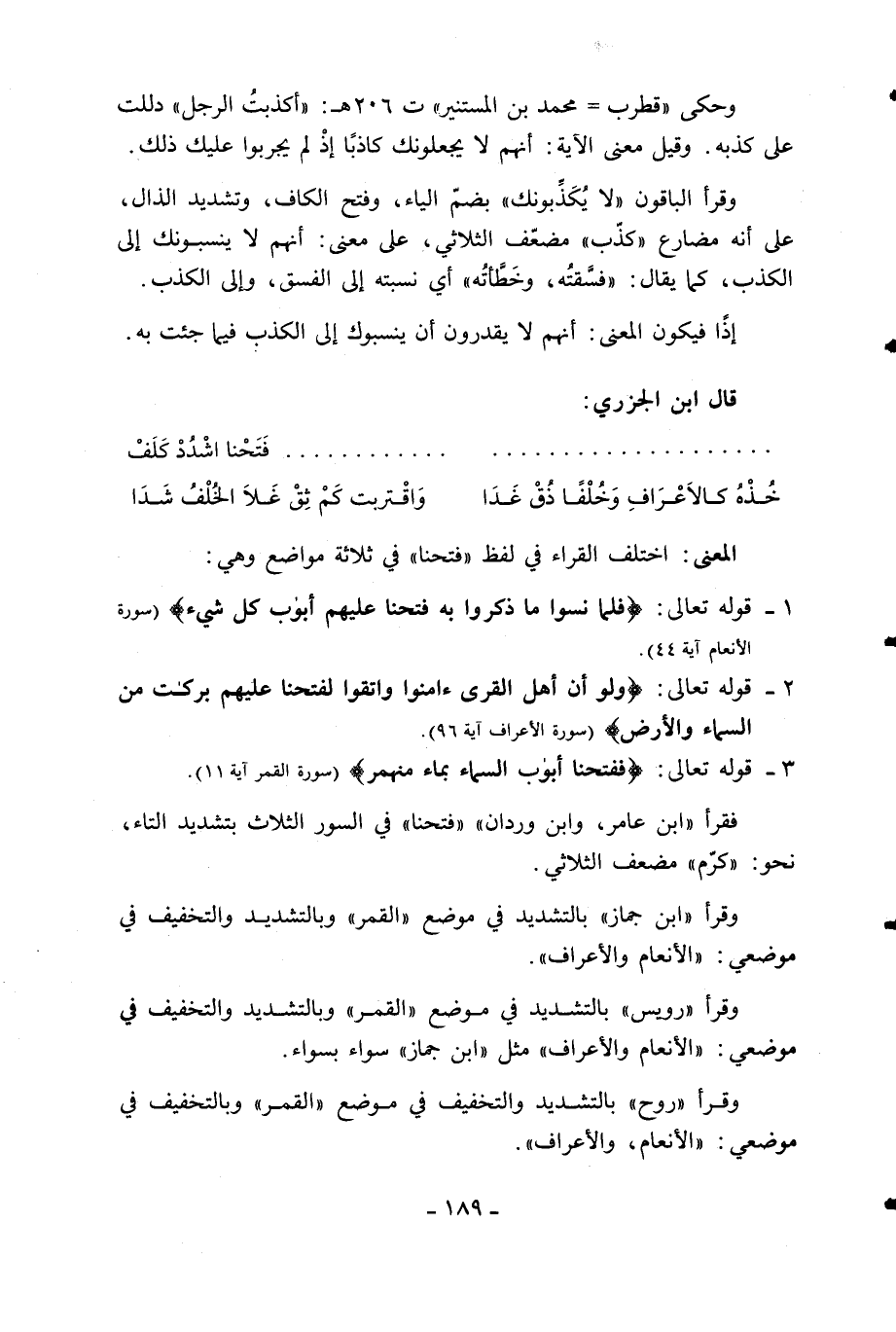 وقرأ «ابن جماز» بالتشديد في موضع «القمر» وبالتشديد والتخفيف في موضعي: «الأنعام والأعراف».