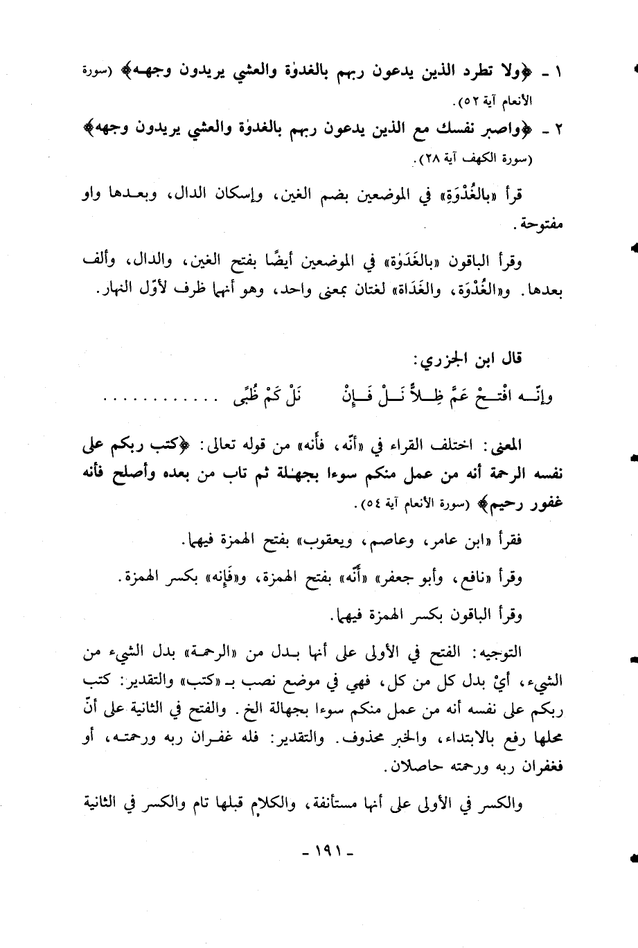 التوجيه: الفتح في الأولى على أنها بدل من «الرحمة» بدل الشيء من الشيء، أي بدل كل من كل، فهي في موضع نصب ب «كتب» والتقدير: كتب ربكم على نفسه أنه من عمل منكم سوءا بجهالة الخ. والفتح في الثانية على أنّ محلها رفع بالابتداء، والخبر محذوف. والتقدير: فله غفران ربه ورحمته، أو فغفران ربه ورحمته حاصلان.
