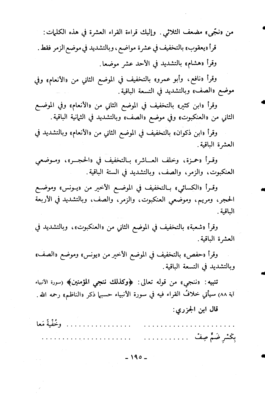 تنبيه: «ننجي» من قوله تعالى: وَكَذلِكَ نُنْجِي الْمُؤْمِنِينَ (سورة الأنبياء آية 88) وسيأتي خلاف القراء فيه في سورة الأنبياء حسبما ذكر «الناظم» رحمه الله.