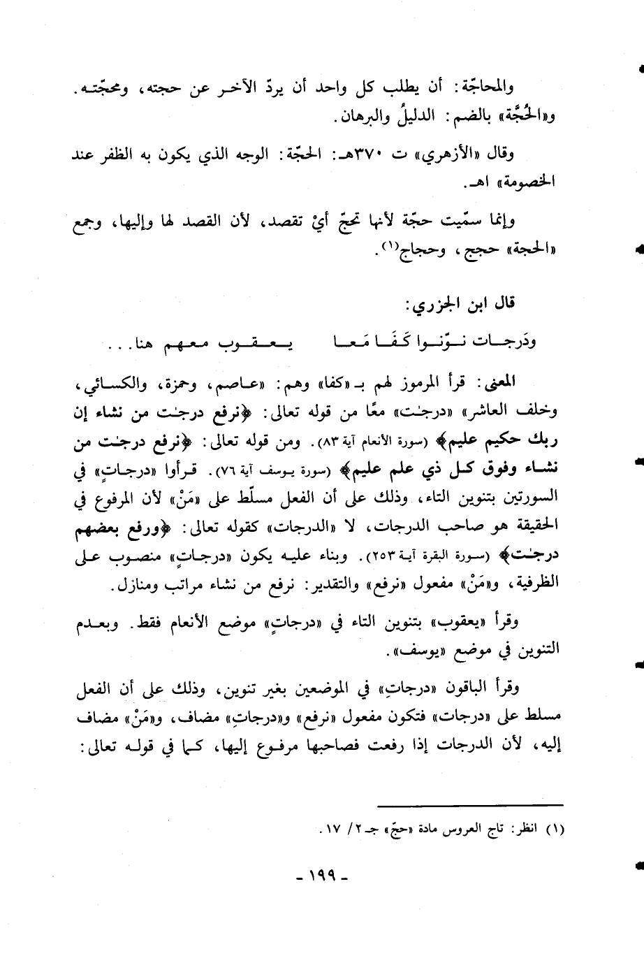 المعنى: قرأ المرموز لهم ب «كفا» وهم: «عاصم، وحمزة، والكسائي، وخلف العاشر» «درجت» معا من قوله تعالى: نَرْفَعُ دَرَجاتٍ مَنْ نَشاءُ إِنَّ رَبَّكَ حَكِيمٌ عَلِيمٌ (سورة الأنعام آية 83). ومن قوله تعالى: نَرْفَعُ دَرَجاتٍ مَنْ نَشاءُ وَفَوْقَ كُلِّ ذِي عِلْمٍ عَلِيمٌ (سورة يوسف آية 76). قرءوا «درجات» في السورتين بتنوين التاء، وذلك على أن الفعل مسلّط على «من» لأن المرفوع في الحقيقة هو صاحب الدرجات، لا «الدرجات» كقوله تعالى: وَرَفَعَ بَعْضَهُمْ دَرَجاتٍ (سورة البقرة آية 253). وبناء عليه يكون «درجات» منصوب على الظرفية، و «من» مفعول «نرفع» والتقدير: نرفع من نشاء مراتب ومنازل.