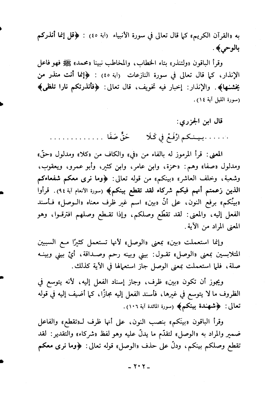 المعنى: قرأ المرموز له بالفاء من «في» والكاف من «كلا» ومدلول «حقّ» ومدلول «صفا» وهم: «حمزة، وابن عامر، وابن كثير، وأبو عمرو، ويعقوب، وشعبة، وخلف العاشر» «بينكم» من قوله تعالى: وَما نَرى مَعَكُمْ شُفَعاءَكُمُ الَّذِينَ زَعَمْتُمْ أَنَّهُمْ فِيكُمْ شُرَكاءُ لَقَدْ تَقَطَّعَ بَيْنَكُمْ (سورة الأنعام آية 94). قرءوا «بينكم» برفع النون، على أنّ «بين» اسم غير ظرف معناه «الوصل» فأسند الفعل إليه، والمعنى: لقد تقطّع وصلكم، وإذا تقطع وصلهم افترقوا، وهو المعنى المراد من الآية.