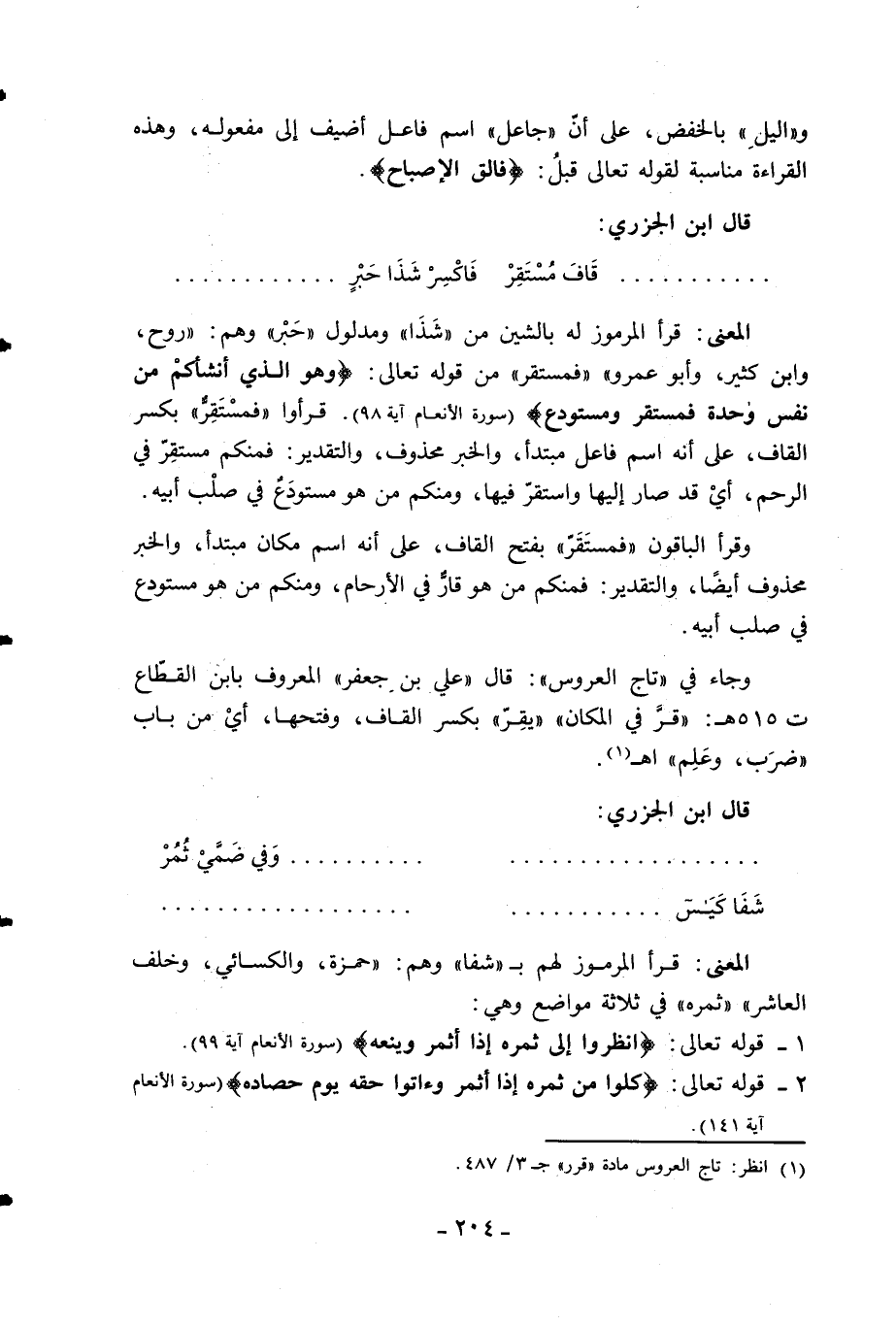 المعنى: قرأ المرموز له بالشين من «شذا» ومدلول «حبر» وهم: «روح، وابن كثير، وأبو عمرو» «فمستقر» من قوله تعالى: وَهُوَ الَّذِي أَنْشَأَكُمْ مِنْ نَفْسٍ واحِدَةٍ فَمُسْتَقَرٌّ وَمُسْتَوْدَعٌ (سورة الأنعام آية 98). قرءوا «فمستقرّ» بكسر القاف، على أنه اسم فاعل مبتدأ، والخبر محذوف، والتقدير: فمنكم مستقرّ في الرحم، أي قد صار إليها واستقرّ فيها، ومنكم من هو مستودع في صلب أبيه.