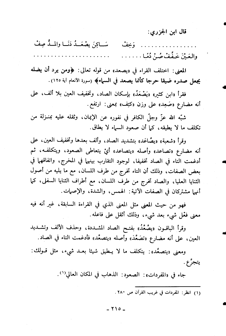 المعنى: اختلف القراء في «يصعد» من قوله تعالى: وَمَنْ يُرِدْ أَنْ يُضِلَّهُ يَجْعَلْ صَدْرَهُ ضَيِّقاً حَرَجاً كَأَنَّما يَصَّعَّدُ فِي السَّماءِ (سورة الأنعام آية 125).