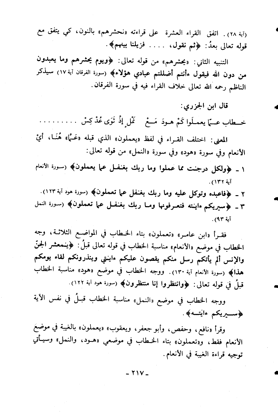 (آية 28). اتفق القراء العشرة على قراءته «نحشرهم» بالنون، كي يتفق مع قوله تعالى بعد: ثُمَّ نَقُولُ، ...... فَزَيَّلْنا بَيْنَهُمْ.