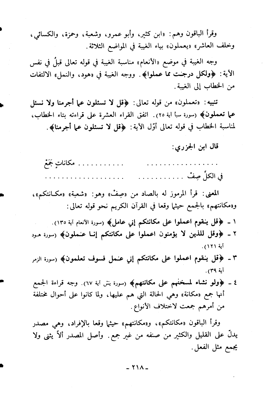 المعنى: قرأ المرموز له بالصاد من «صف» وهو: «شعبة» «مكانتكم»، و «مكانتهم» بالجمع حيثما وقعا في القرآن الكريم نحو قوله تعالى: