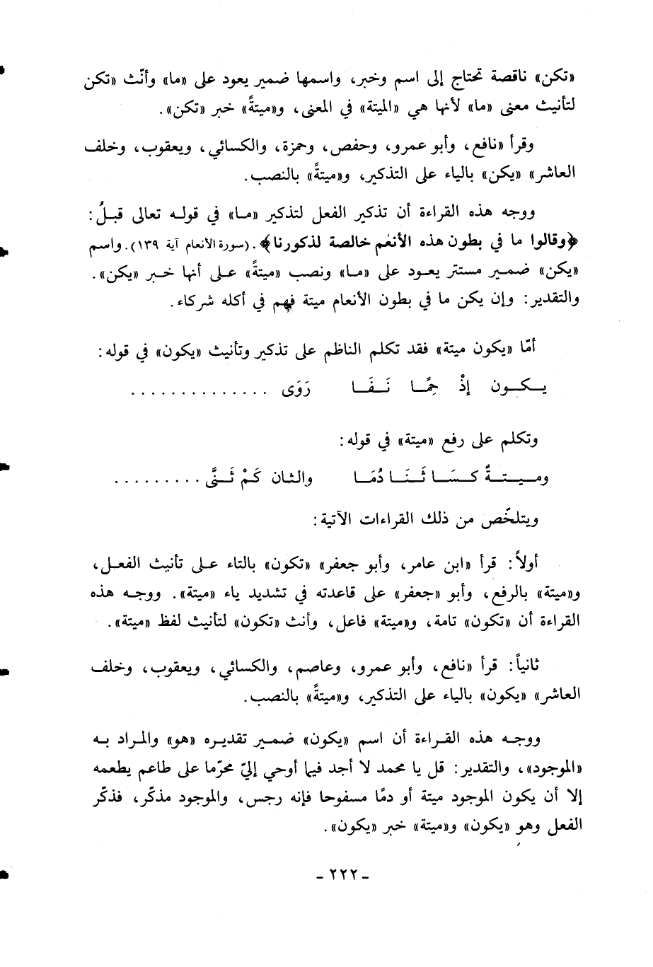 ثانيا: قرأ «نافع، وأبو عمرو، وعاصم، والكسائي، ويعقوب، وخلف العاشر» «يكون» بالياء على التذكير، و «ميتة» بالنصب.