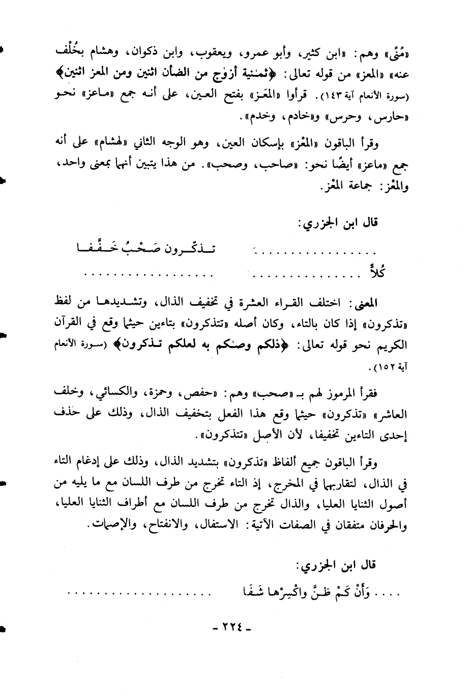 «منى» وهم: «ابن كثير، وأبو عمرو، ويعقوب، وابن ذكوان، وهشام بخلف عنه» «المعز» من قوله تعالى: ثَمانِيَةَ أَزْواجٍ مِنَ الضَّأْنِ اثْنَيْنِ وَمِنَ الْمَعْزِ اثْنَيْنِ (سورة الأنعام آية 143). قرءوا «المعز» بفتح العين، على أنه جمع «ماعز» نحو «حارس، وحرس» و «خادم، وخدم».