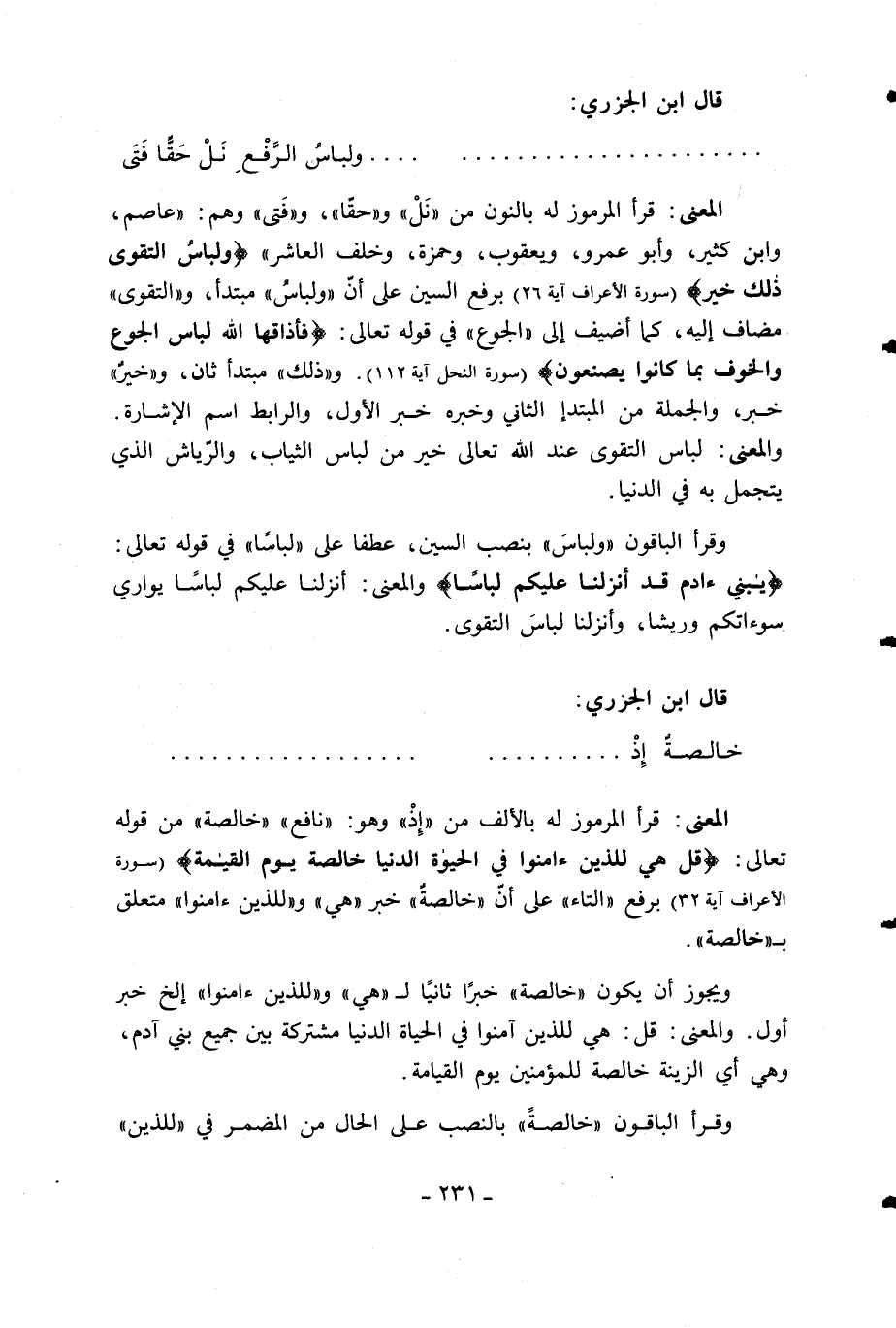 المعنى: قرأ المرموز له بالنون من «نل» و «حقّا»، و «فتى» وهم: «عاصم، وابن كثير، وأبو عمرو، ويعقوب، وحمزة، وخلف العاشر» وَلِباسُ التَّقْوى ذلِكَ خَيْرٌ (سورة الأعراف آية 26) برفع السين على أنّ «ولباس» مبتدأ، و «التقوى» مضاف إليه، كما أضيف إلى «الجوع» في قوله تعالى: فَأَذاقَهَا اللَّهُ لِباسَ الْجُوعِ وَالْخَوْفِ بِما كانُوا يَصْنَعُونَ (سورة النحل آية 112). و «ذلك» مبتدأ ثان، و «خير» خبر، والجملة من المبتدإ الثاني وخبره خبر الأول، والرابط اسم الإشارة.