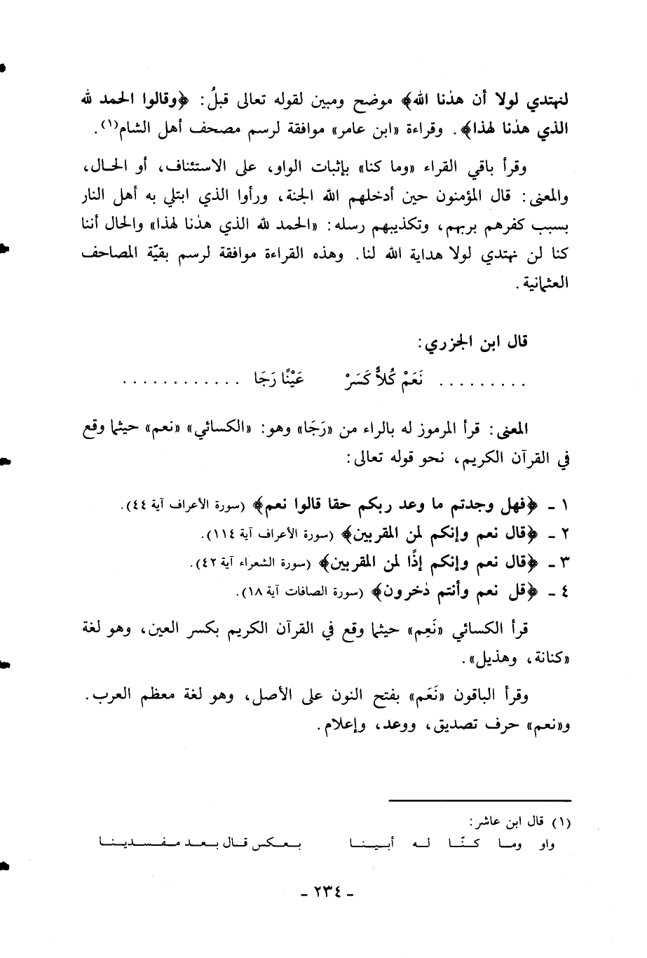المعنى: قرأ المرموز له بالراء من «رجا» وهو: «الكسائي» «نعم» حيثما وقع في القرآن الكريم، نحو قوله تعالى: