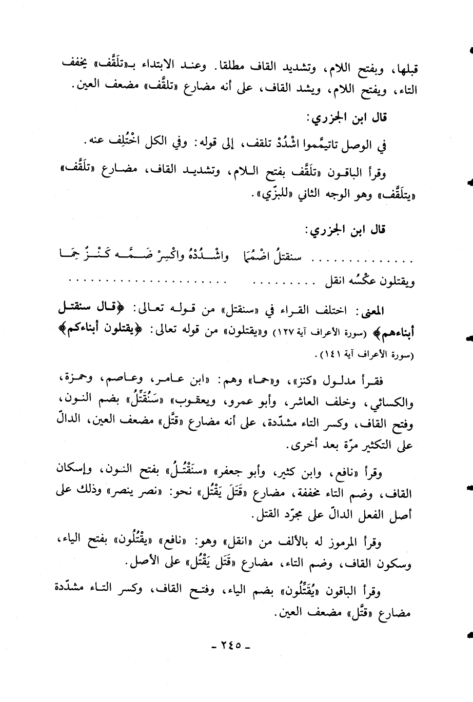 المعنى: اختلف القراء في «سنقتل» من قوله تعالى: قالَ سَنُقَتِّلُ أَبْناءَهُمْ (سورة الأعراف آية 127) و «يقتلون» من قوله تعالى: يُقَتِّلُونَ أَبْناءَكُمْ (سورة الأعراف آية 141).