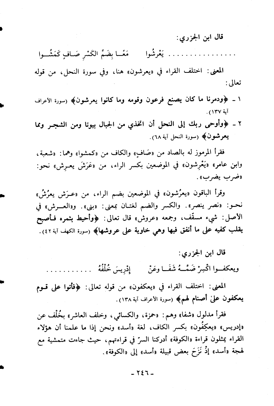 وقرأ الباقون «يعرشون» في الموضعين بضم الراء، من «عرش يعرش» نحو: «نصر ينصر». والكسر والضم لغتان بمعنى: «بنى». و «العرش» في الأصل: شيء مسقّف، وجمعه «عروش» قال تعالى: وَأُحِيطَ بِثَمَرِهِ فَأَصْبَحَ يُقَلِّبُ كَفَّيْهِ عَلى ما أَنْفَقَ فِيها وَهِيَ خاوِيَةٌ عَلى عُرُوشِها (سورة الكهف آية 42).