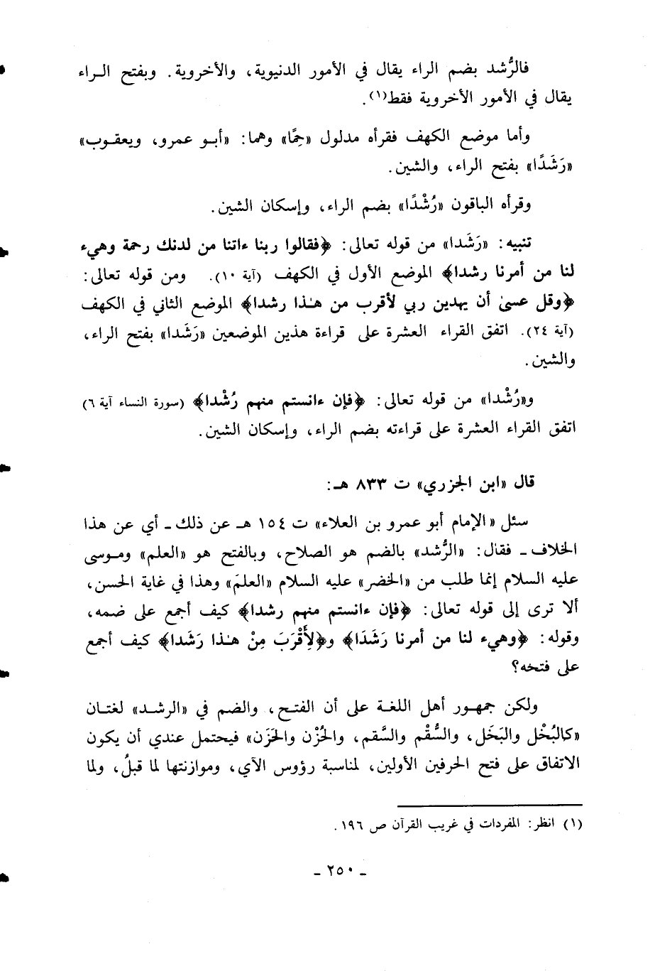 سئل «الإمام أبو عمرو بن العلاء» ت 154 هـ- عن ذلك- أي عن هذا الخلاف- فقال: «الرّشد» بالضم هو الصلاح، وبالفتح هو «العلم» وموسى عليه السلام إنما طلب من «الخضر» عليه السلام «العلم» وهذا في غاية الحسن، ألا ترى إلى قوله تعالى: فَإِنْ آنَسْتُمْ مِنْهُمْ رُشْداً كيف أجمع على ضمه، وقوله: وَهَيِّئْ لَنا مِنْ أَمْرِنا رَشَداً ولِأَقْرَبَ مِنْ هذا رَشَداً كيف أجمع على فتحه؟