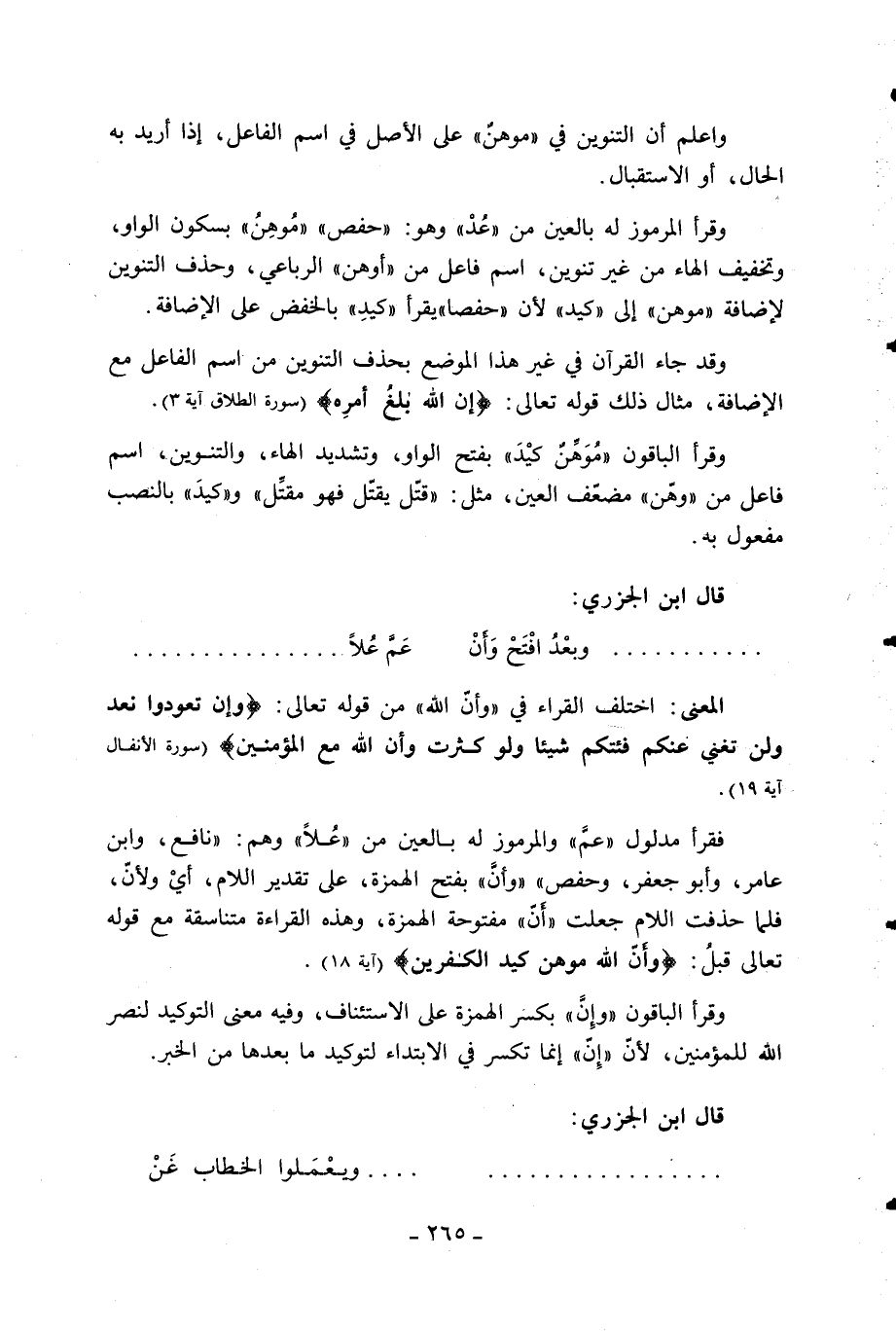 فقرأ مدلول «عمّ» والمرموز له بالعين من «علا» وهم: «نافع، وابن عامر، وأبو جعفر، وحفص» «وأنّ» بفتح الهمزة، على تقدير اللام، أي ولأنّ، فلما حذفت اللام جعلت «أنّ» مفتوحة الهمزة، وهذه القراءة متناسقة مع قوله تعالى قبل: وَأَنَّ اللَّهَ مُوهِنُ كَيْدِ الْكافِرِينَ (آية 18).