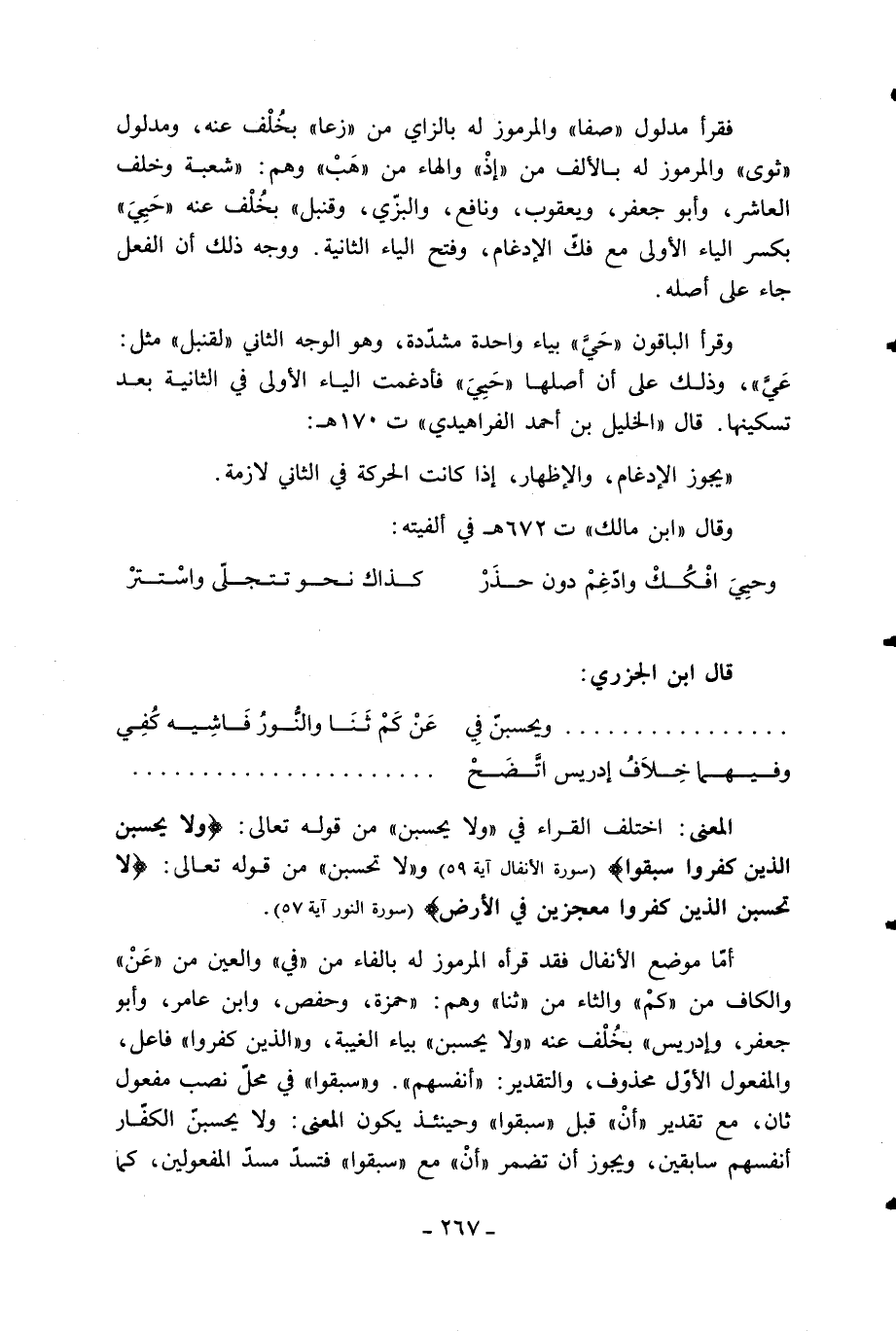 أمّا موضع الأنفال فقد قرأه المرموز له بالفاء من «في» والعين من «عن» والكاف من «كم» والثاء من «ثنا» وهم: «حمزة، وحفص، وابن عامر، وأبو جعفر، وإدريس» بخلف عنه «ولا يحسبن» بياء الغيبة، و «الذين كفروا» فاعل، والمفعول الأوّل محذوف، والتقدير: «أنفسهم». و «سبقوا» في محلّ نصب مفعول ثان، مع تقدير «أن» قبل «سبقوا» وحينئذ يكن المعنى: ولا يحسبنّ الكفّار أنفسهم سابقين، ويجوز أن تضمر «أن» مع «سبقوا» فتسدّ مسدّ المفعولين، كما
