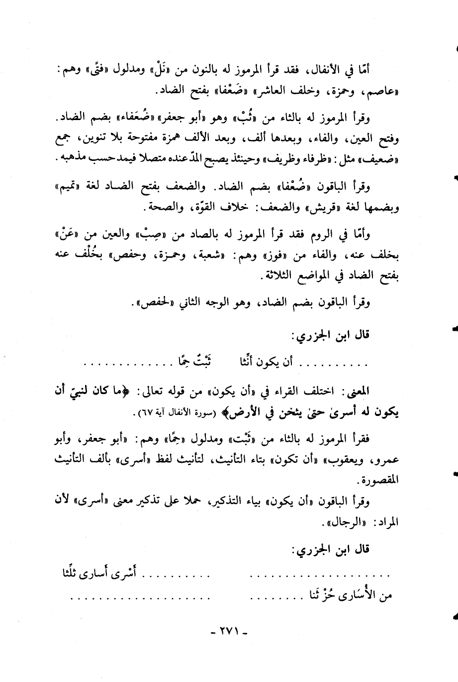 فقرأ المرموز له بالثاء من «ثبت» ومدلول «حما» وهم: «أبو جعفر، وأبو عمرو، ويعقوب» «أن تكون» بتاء التأنيث، لتأنيث لفظ «أسرى» بألف التأنيث المقصورة.