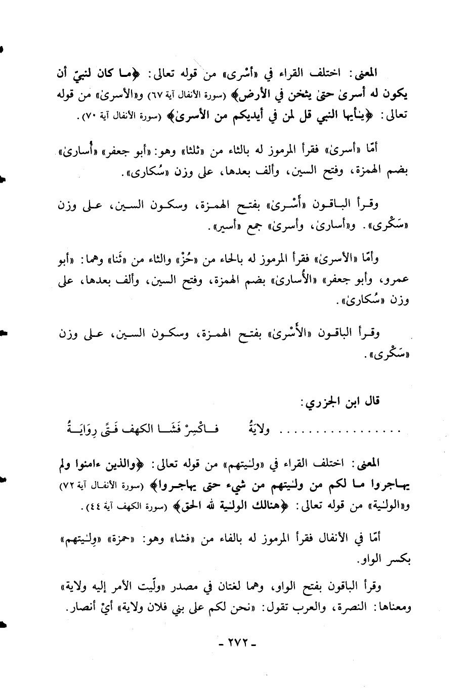 المعنى: اختلف القراء في «وليتهم» من قوله تعالى: وَالَّذِينَ آمَنُوا وَلَمْ يُهاجِرُوا ما لَكُمْ مِنْ وَلايَتِهِمْ مِنْ شَيْءٍ حَتَّى يُهاجِرُوا (سورة الأنفال آية 72) و «الولية» من قوله تعالى: هُنالِكَ الْوَلايَةُ لِلَّهِ الْحَقِّ (سورة الكهف آية 44).