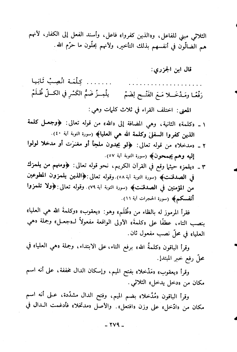 فقرأ المرموز له بالظاء من «ظلم» وهو: «يعقوب» «وكلمة الله هي العليا» بنصب التاء، عطفا على «كلمة» الأولى الواقعة مفعولا ل «جعل» وجملة «هي العليا» في محلّ نصب مفعول ثان.