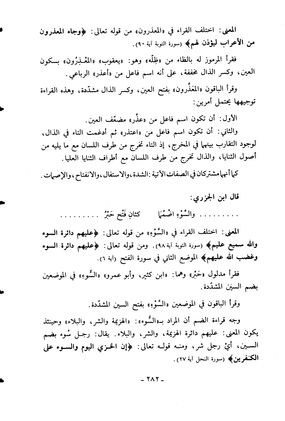 فقرأ مدلول «حبر» وهما: «ابن كثير، وأبو عمرو» «السّوء» في الموضعين بضم السين المشدّدة.